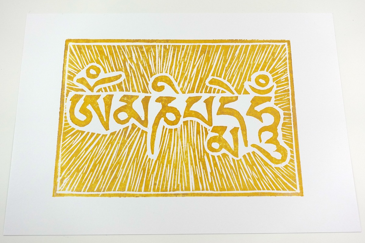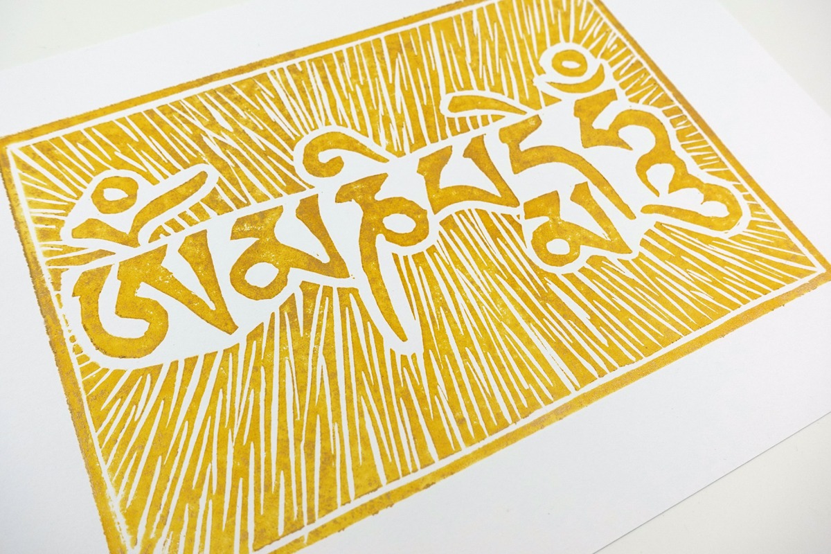 Autorský linoryt mantry Om mani peme hung