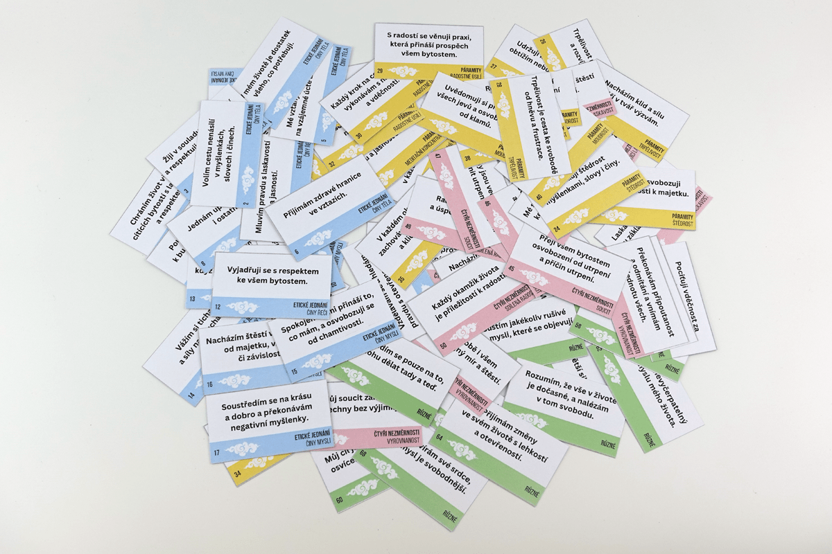 • 70 pečlivě vytvořených afirmací inspirovaných páramitami, etikou a čtyřmi nezměrnostmi – základy buddhistické praxe.