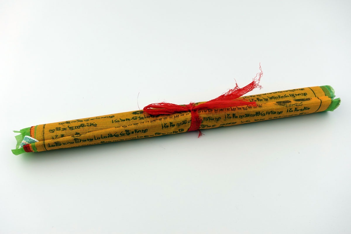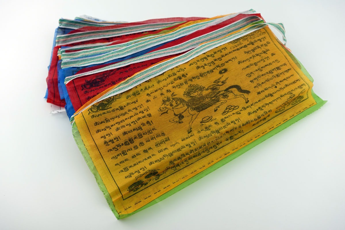• Tibetské modlitební praporky podélného tvaru. Mají být věšeny volně v přírodě a pohybem ve větru se z praporků šíří mantra dál (více informací).